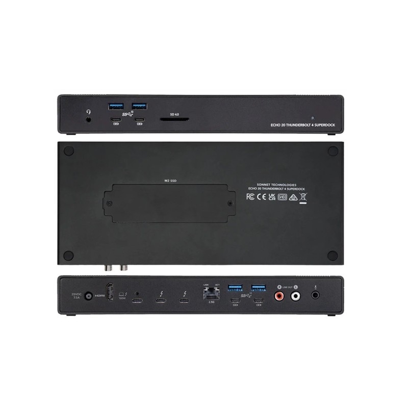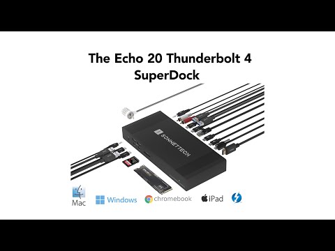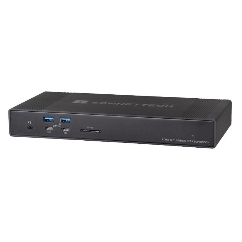תחנת העגינה Sonnet Echo 20 Thunderbolt 4 SuperDock משתמשת ב-Thunderbolt 4 כדי לספק מגוון חיבורים ואפשרויות הרחבה עם חיבור כבל יחיד למחשב תואם. התחנה כוללת יציאות כמו Thunderbolt 4, USB 3.2 Gen 2, 2.5 GbE RJ45 LAN, יציאות אודיו 3.5 מ"מ, HDMI 2.1 לתצוגות 8K, ואפשרויות הרחבת אחסון כגון חריץ M.2 NVMe SSD וקריאר כרטיס SD 4.0, Echo 20 עוצב לשדרג את זרימת העבודה שלך.