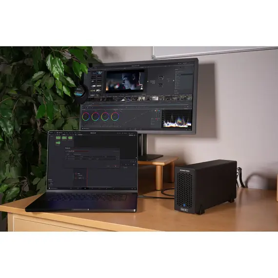 בנוסף, המארז כולל שני חיבורי Thunderbolt 5, כך שניתן לחבר את המערכת למחשב ולשרשר התקנים נוספים (daisy-chain).