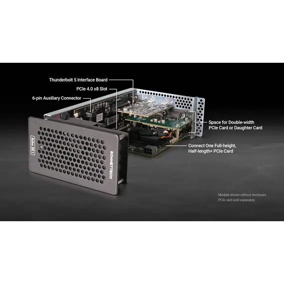 המארז תומך בכרטיס PCIe 4.0 x8 בגובה מלא ובאורך עד 7.75 אינץ׳, ומספק רוחב פס גבוה במיוחד הודות לממשק Thunderbolt 5, המאפשר העברת נתונים של עד 80Gb/s. פתרון זה מתאים במיוחד לחיבור כרטיסי וידאו מקצועיים, כרטיסי רשת 25GbE, בקרי אחסון SAS/SATA, כרטיסי NVMe ועוד.